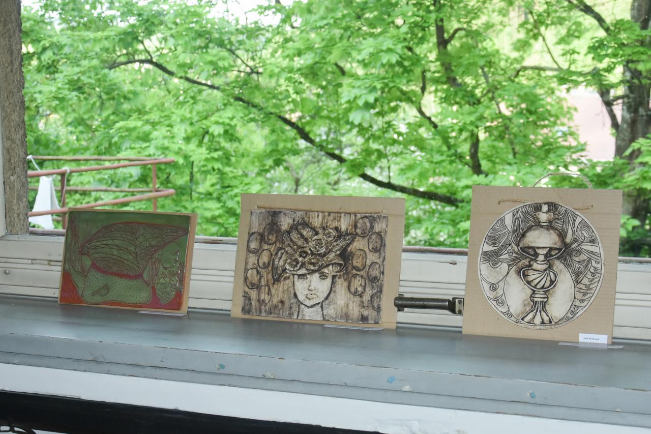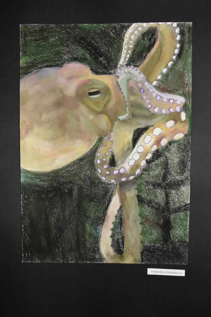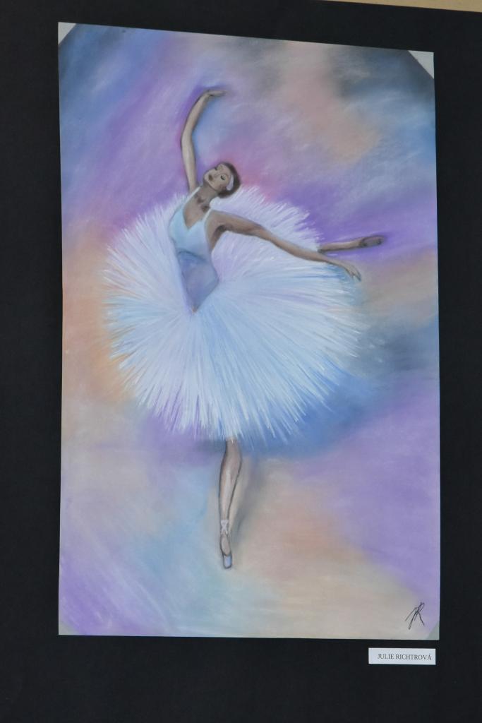 Fotografie z výstavy absolventských i jiných prací žáků výtvarného oboru v hlavní budově školy.