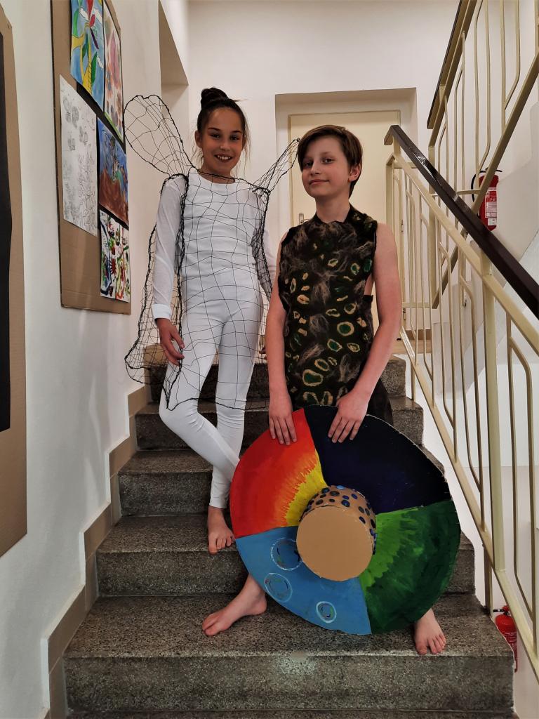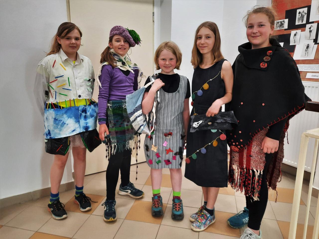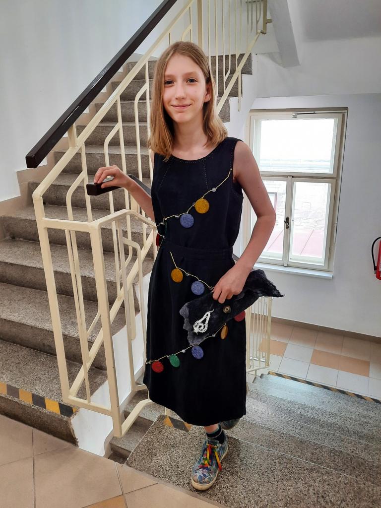 V rámci soutěže jsme se pokusili pomocí různých textilních technik (šití, vyšívání, pletení, háčkování, tkaní na ručním stavu, paličkování, batikování, barvení, suché i mokré plstění,…) ztvárnit oděv.