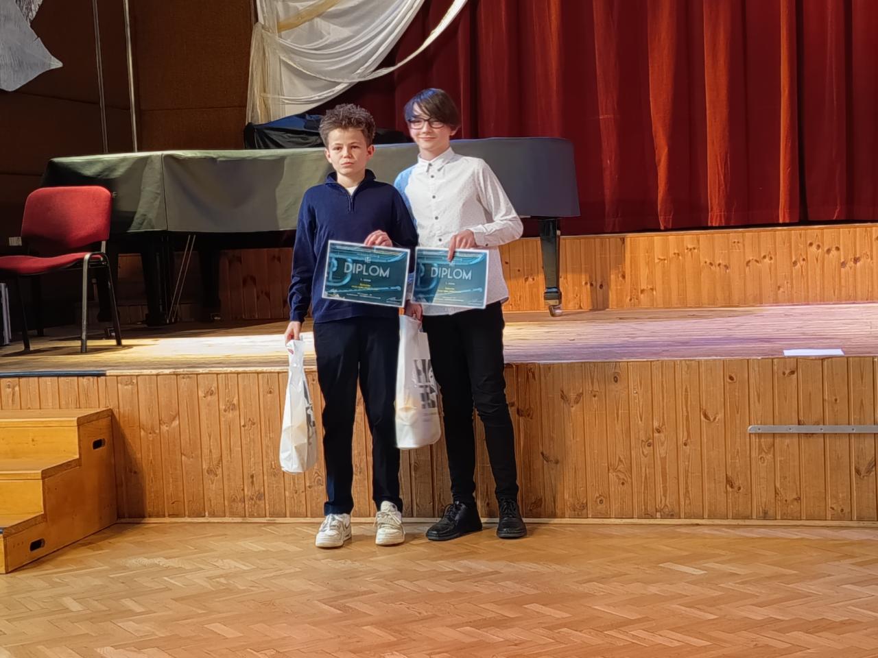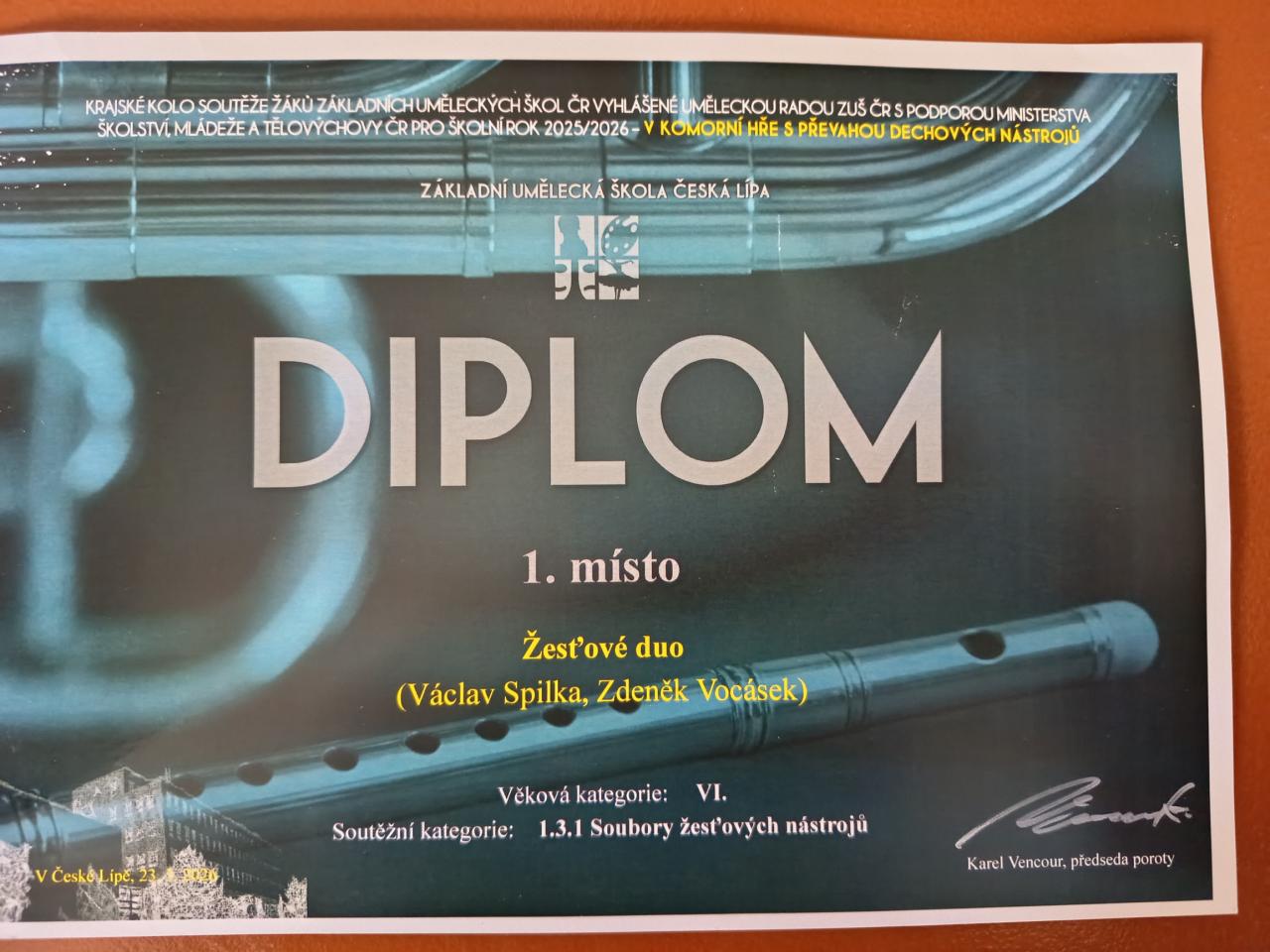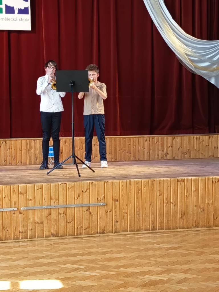 Gratulujeme Žesťovému duu ve složení Václav Spilka a Zdeněk Vocásek k 1. místu v krajském kole soutěže ve hře souborů dechových nástrojů, které se konalo v České Lípě. Děkujeme panu učiteli za jejich přípravu. Zároveň děkujeme za vzornou reprezentaci naší ZUŠ.